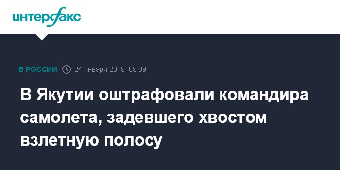 Москва. 24 января. INTERFAX.RU - Капитан самолета авиакомпании "Якутия", который при взлете в аэропорту Нерюнгри задел хвостовой частью взлетно-посадочную полосу (ВПП), оштрафован на 12,5 тыс. руб., сообщает пресс-служба Восточно-Сибирской транспортной прокуратуры.