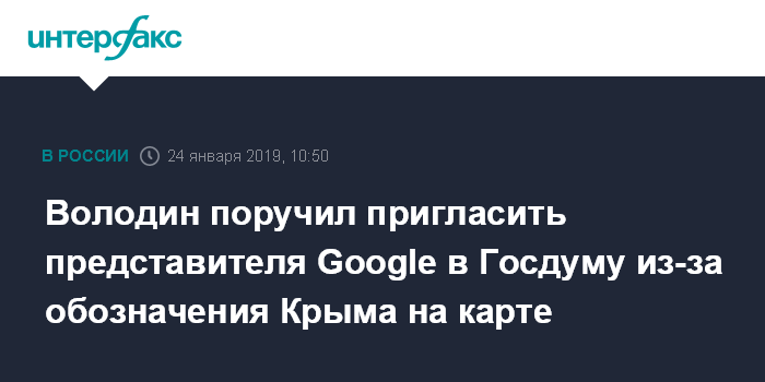 Москва. 24 января. INTERFAX.RU - Спикер Госдумы Вячеслав Володин поручил пригласить в Госдуму представителя компании Google в связи с обозначением российского Крыма в качестве территории Украины.