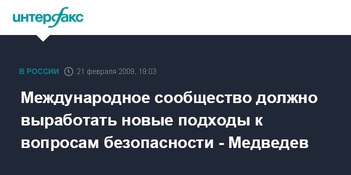 Москва. 21 февраля. INTERFAX.RU - Президент России Дмитрий Медведев призывает выработать новые подходы к обеспечению международной безопасности.
