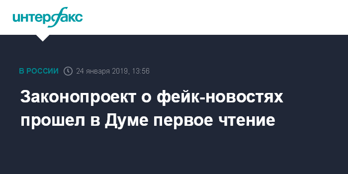 Москва. 24 января. INTERFAX.RU - Госдума в четверг приняла в первом чтении пакет законопроектов о фейковых новостях, в частности, о штрафах до 1 млн рублей за распространение в СМИ и интернете заведомо недостоверной информации, создающей угрозу здоровью граждан и массового нарушения общественного порядка.