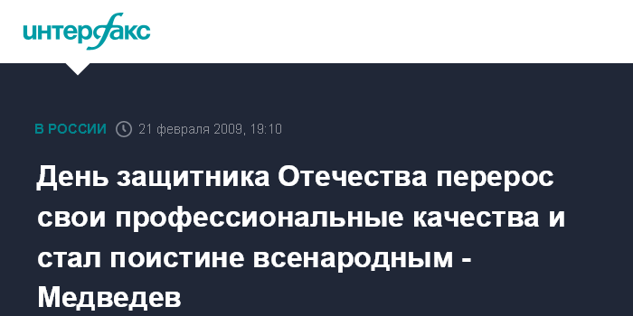 По словам Д.Медведева, этот праздничный день "стал данью глубокого уважения ко всем, кто служит Отечеству, охраняет суверенитет и национальные интересы России, кто продолжает ее исторические победные традиции".