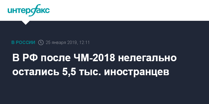 Москва. 25 января. INTERFAX.RU - Более 5 тысяч иностранных граждан, приехавших на чемпионат мира по футболу 2018, до сих пор остаются на территории РФ в нарушении порядка пребывания.