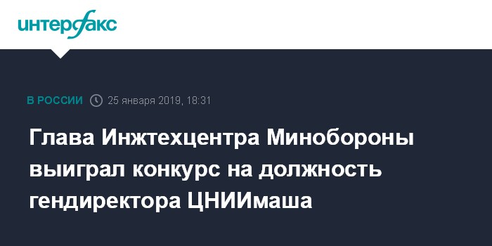 "В пятницу состоялся конкурс на замещение должности генерального директора Федерального государственного унитарного предприятия "Центральный научно-исследовательский институт машиностроения" (ФГУП "ЦНИИмаш"). Комиссия под председательством и.о. заместителя генерального директора по ракетно-космической промышленности госкорпорации "Роскосмос" Ивана Харченко признала победителем конкурса на замещение должности генерального директора ФГУП "ЦНИИмаш" Сергея Коблова, который будет назначен на должность генерального директора предприятия", - говорится в сообщении.