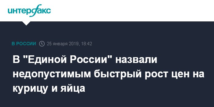 Москва. 25 января. INTERFAX.RU - В партии "Единая Россия" заявили о необоснованности резкого роста цен на продукты, входящие в потребительскую корзину, и в частности, на курицу и яйца.
