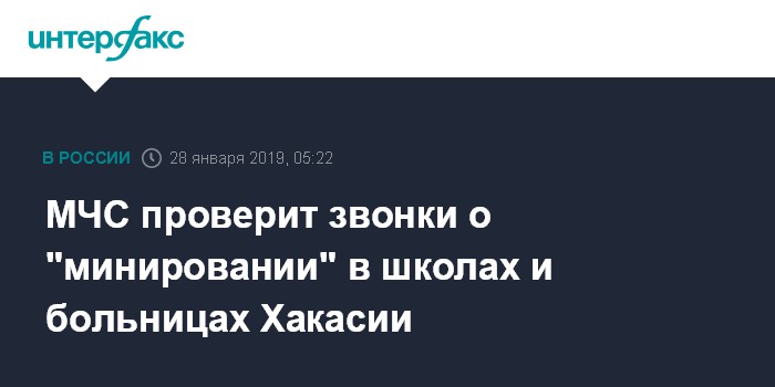 Москва. 28 января. INTERFAX.RU - Сотрудники МЧС проверяют звонки от неизвестных, которые сообщают о минировании школ и больниц в Хакасии, сообщили агентству "Интерфакс-Сибирь" в пресс-службе Главного управления МЧС по республике в понедельник.