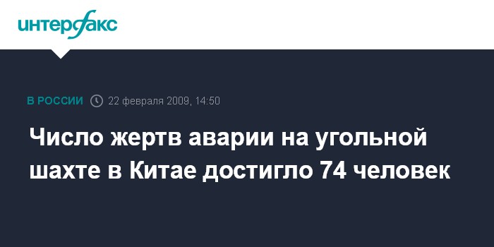 Пекин. 22 февраля. INTERFAX.RU - В результате взрыва метана на угольной шахте в центральной китайской провинции Шаньси погибли 74 человека, еще 114 шахтеров, их которых пятеро в критическом состоянии, находятся в больницах, сообщили местные СМИ с места аварии.