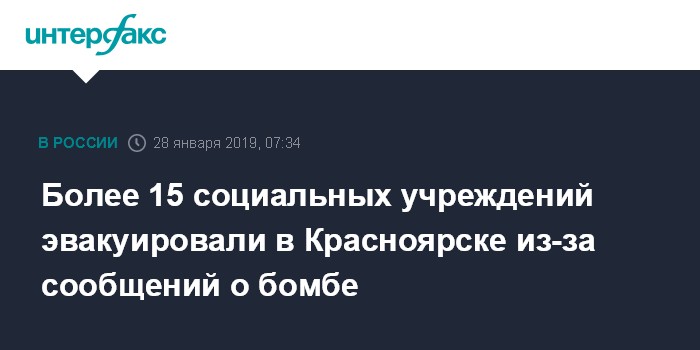 Москва. 28 января. INTERFAX.RU - Более 15 социальных учреждений, в том числе школ и больниц эвакуировали в Красноярске из-за сообщений о "минировании", сообщил агентству "Интерфакс" источник в правоохранительных органах.