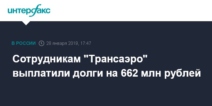Москва. 28 января. INTERFAX.RU - Работникам обанкротившейся авиакомпании "Трансаэро" выплачены долги по зарплате на сумму 662 млн рублей, сообщили в Генпрокуратуре России в понедельник.
