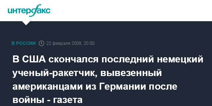 В США скончался последний немецкий ученый-ракетчик, вывезенный американцами из Германии после войны - газета