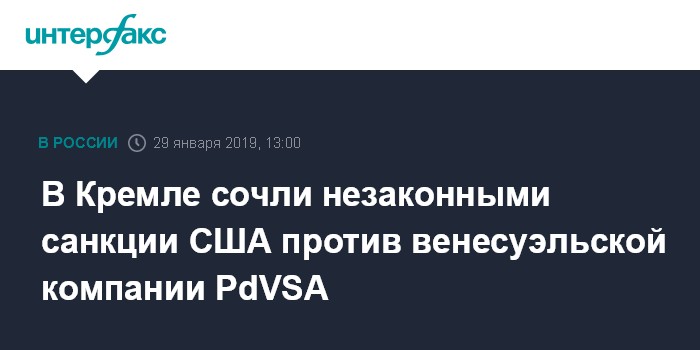 Москва. 29 января. INTERFAX.RU - В Кремле считают незаконными санкции США против венесуэльской нефтегазовой компании PdVSA, заявил пресс-секретарь президента России Дмитрий Песков.