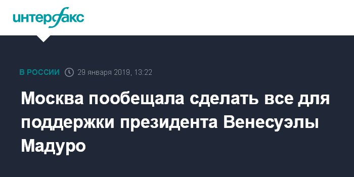 Москва. 29 января. INTERFAX.RU - Россия вместе с другими ответственными членами мирового сообщества будет делать все, чтобы поддержать законное правительство президента Николаса Мадуро в отстаивании венесуэльской Конституции и тех методов урегулирования кризиса, которые находятся в конституционном поле, заявил на пресс-конференции в Москве глава МИД РФ Сергей Лавров.
