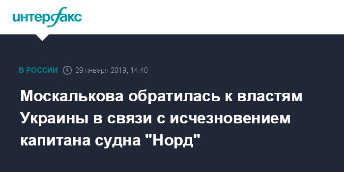 Москва. 29 января. INTERFAX.RU - Уполномоченный по правам человека в РФ Татьяна Москалькова просит власти Украины предоставить данные о местонахождении капитана судна "Норд" (порт приписки - Керчь, Крым) Владимира Горбенко.
