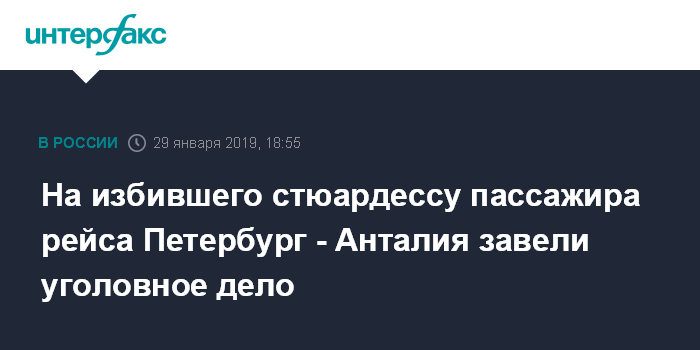Москва. 29 января. INTERFAX.RU - На авиадебошира, избившего стюардессу во время рейса Санкт-Петербург - Анталия, завели уголовное дело, сообщает во вторник пресс-служба Следственного комитета.