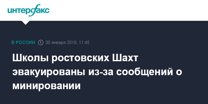 Москва. 30 января. INTERFAX.RU - Все школы города Шахты Ростовской области эвакуированы из-за сообщений о минировании в среду утром, сообщили агентству "Интерфакс" в городской администрации.