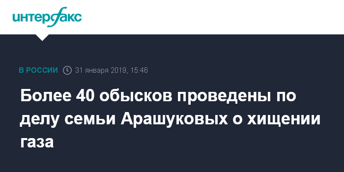 Москва. 31 января. INTERFAX.RU - Следователи провели более 40 обысков в 11 регионах РФ по делу о хищении газа у ПАО "Газпром", фигурантами которого являются члены семьи Арашуковых, сообщили "Интерфаксу" в четверг в пресс-службе Следственного комитета России (СКР).
