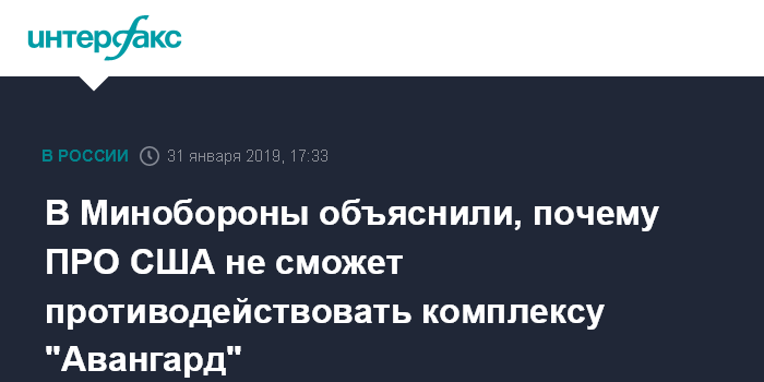 Москва. 31 января. INTERFAX.RU - Космический эшелон перехвата противоракетной обороны (ПРО), который создают США, не сможет противодействовать российскому гиперзвуковому ракетному комплексу "Авангард", заявляют в Минобороны РФ.