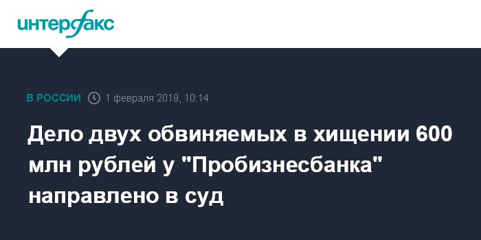 Дело двух обвиняемых в хищении 600 млн рублей у "Пробизнесбанка" направлено в суд