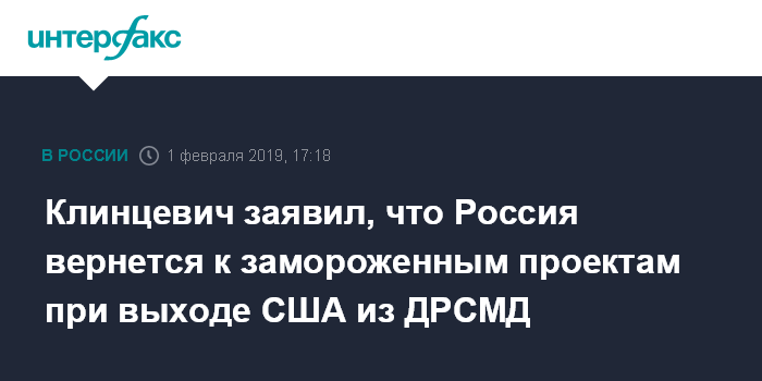 Москва. 1 февраля. INTERFAX.RU - Если США выйдут из Договора о ракетах средней и меньшей дальности, России придется возобновить замороженные советские проекты, связанные с использованием подобных ракет, модернизировав их, заявил член Комитета Совета Федерации по обороне и безопасности Франц Клинцевич.