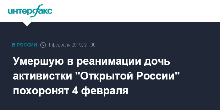Москва. 1 февраля. INTERFAX.RU - Умершую в реанимации старшую дочь активистки "Открытой России" Анастасии Шевченко похоронят в понедельник, сообщил агентству "Интерфакс" знакомый семьи Шевченко.