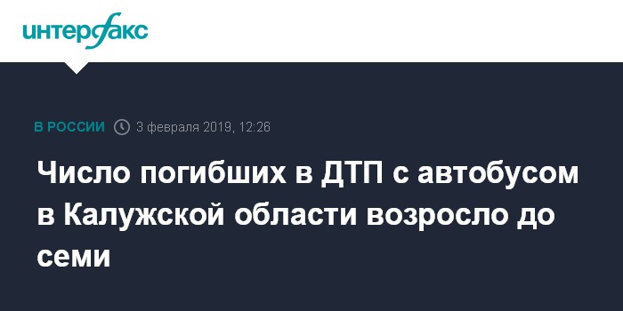 Москва. 3 февраля. INTERFAX.RU - Число погибших в аварии с автобусом в Калужской области возросло до семи, среди них четверо детей, сообщили "Интерфаксу" в пресс-службе областного главка полиции.