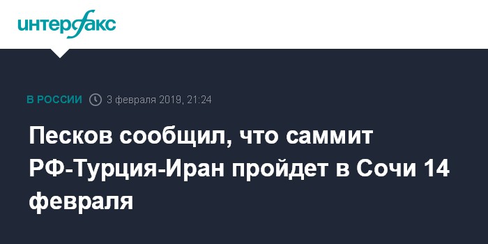 Песков сообщил, что саммит РФ-Турция-Иран пройдет в Сочи 14 февраля