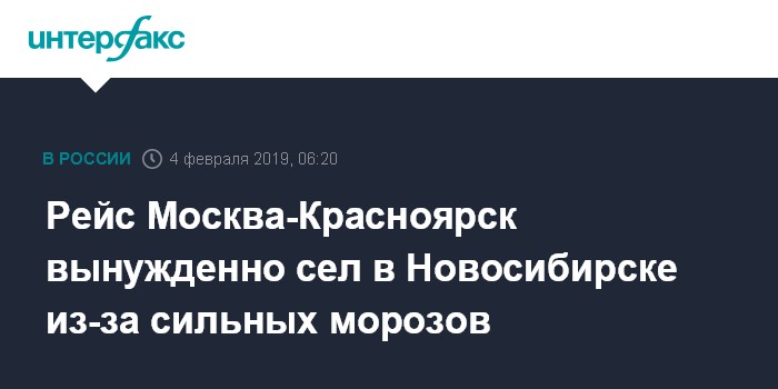 Москва. 4 февраля. INTERFAX.RU - Рейс авиакомпании "Аэрофлот" следовавший из Москвы в Красноярск, совершил вынужденную посадку в Новосибирске из-за морозов, сообщили агентству "Интерфакс" в красноярском аэропорту.