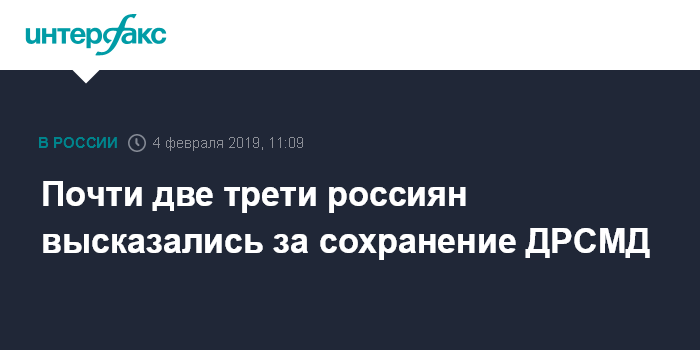 Москва. 4 февраля. INTERFAX.RU - Большинство россиян полагают, что Москве следует сохранить свое участие в Договоре о ликвидации ракет средней и меньшей дальности (ДРСМД), свидетельствуют данные опроса ВЦИОМ, размещенные в понедельник на официальном сайте социологического центра.