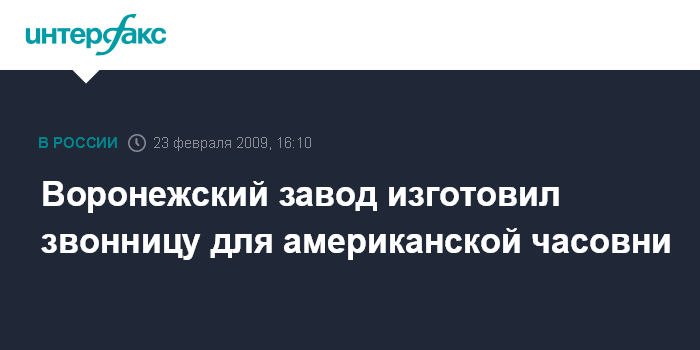 Воронеж. 23 февраля. INTERFAX.RU - Мастера воронежского колокололитейного завода "Вера" завершили изготовление звонницы для новой часовни в американском штате Канзас, сообщил "Интерфаксу" представитель завода.