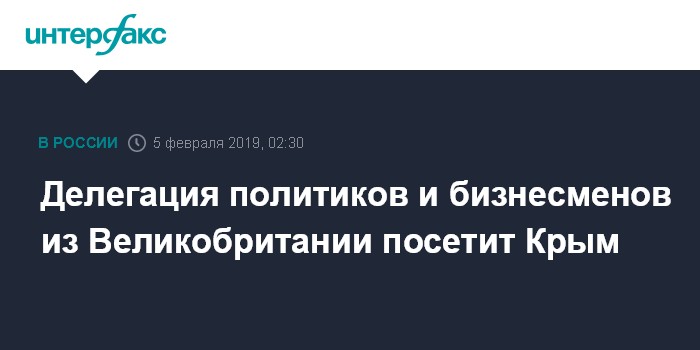 Москва. 5 февраля. INTERFAX.RU - Делегация британских политиков, экспертов и предпринимателей в апреле 2019 года впервые за последние пять лет посетит Республику Крым, сообщает во вторник газета "Известия" со ссылкой на главу региона Сергея Аксенова.