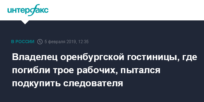 Москва. 5 февраля. INTERFAX.RU - Следственные органы СК Оренбургской области возбудили уголовное дело на владельца дома-гостиницы, в которой погибли трое рабочих, за попытку подкупить следователя.