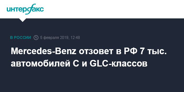 Москва. 5 февраля. INTERFAX.RU - АО "Мерседес Бенц Рус" (100%-ное дочернее предприятие немецкого концерна Daimler AG) отзывает в РФ 7,011 тыс. автомобилей Mercedes-Benz C и GLC-классов (тип 205, тип 253).