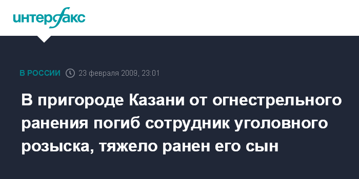 Казань. 23 января. ИНТЕРФАКС-ПОВОЛЖЬЕ - Правоохранительные органы Татарстана расследуют трагический случай, в результате которого погиб начальник одного отделов уголовного розыска МВД по республике Дамир Вахитов, ранен его 13-летний сын.