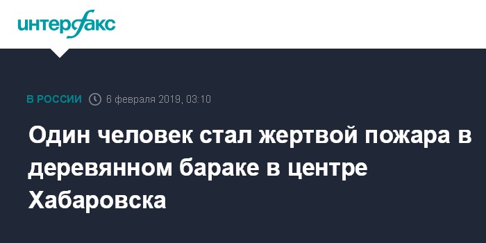 Москва. 6 февраля. INTERFAX.RU - Деревянный жилой барак сгорел в центре Хабаровска, погиб один человек, сообщили агентству "Интерфакс" в Единой дежурно-диспетчерской службе города.