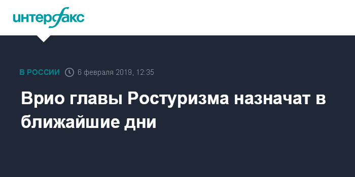 Москва. 6 февраля. INTERFAX.RU - Временно исполняющий обязанности главы Ростуризма должен быть назначен в среду или четверг, сообщила журналистам в среду исполнительный директор Ассоциации туроператоров России (АТОР) Майя Ломидзе.