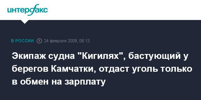 Москва. 24 февраля. INTERFAX.RU - Груз угля - более 4 тыс. тонн - согласен разгрузить только в обмен на зарплату бастующий экипаж транспортного судна "Кигилях", которое стоит на рейде в Авачинской бухте. "Еды и воды на борту судна осталось всего дня на два. Но сдаваться моряки не намерены. Сдать уголь в порт экипаж готов только после выплаты зарплаты", - сообщил во вторник агентству "Интерфакс - Дальний Восток" матрос судна "Кигилях" Виталий Моторин.
