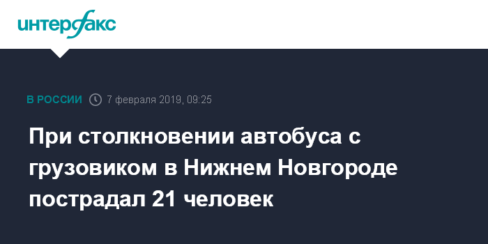 Москва. 7 февраля. INTERFAX.RU - В результате столкновения автобуса ПАЗ и грузовика в Нижнем Новгороде в четверг утром пострадал 21 человек, сообщил агентству "Интерфакс" информированный источник.