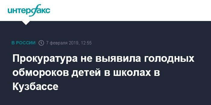 Москва. 7 февраля. INTERFAX.RU - Прокурорская проверка не подтвердила заявление кузбасского детского омбудсмена Дмитрия Кислицына о голодных обмороках детей в школах региона. Об этом сообщает пресс-служба прокуратуры Кемеровской области в четверг.