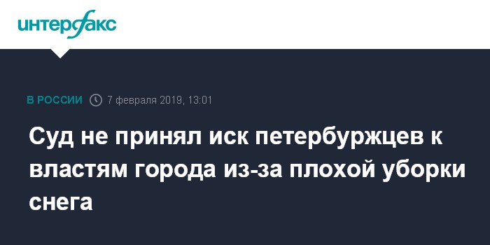 Петербургские депутаты предложили ввести режим ЧС из-за ситуации с уборкой снегаЧитать подробнееСуд отказал в принятии иска в связи с тем, что данный спор не подлежит рассмотрению в порядке административного судопроизводства.