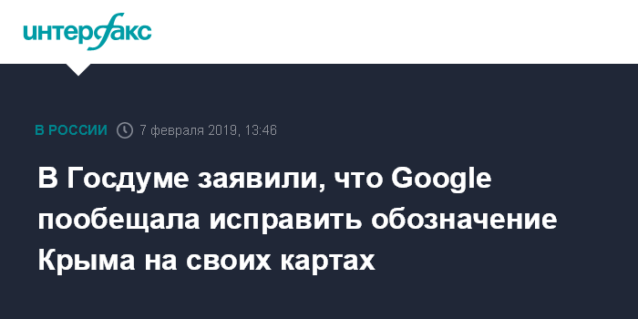 Москва. 7 февраля. INTERFAX.RU - Google обещает, что в течение ближайшего времени ситуация с обозначением Крыма на картах компании будет исправлена, сообщил председатель комитета Госдумы по безопасности и противодействию коррупции Василий Пискарев.