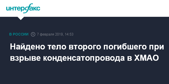Москва. 7 февраля. INTERFAX.RU - Найдено тело второго погибшего в результате взрыва на конденсатопроводе "Уренгой-Сургут", сообщили агентству "Интерфакс" в пресс-службе СУ СКР по ХМАО в четверг.