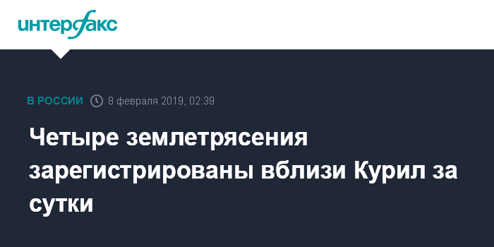 Москва. 8 февраля. INTERFAX.RU - Четыре землетрясения зарегистрированы за прошедшие сутки возле Курильских островов Сахалинской области, сообщили в пятницу агентству "Интерфакс" в Сахалинском филиале Единой Геофизической службы РАН.