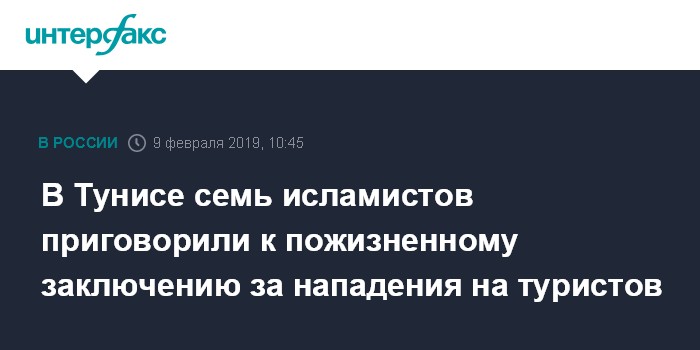 Москва. 9 февраля. INTERFAX.RU - Суд Туниса приговорил к пожизненному лишению свободы семь исламистов, признав их виновными в нападениях на туристов в 2015 году, в ходе которых погибли десятки людей, сообщают в субботу западные СМИ.