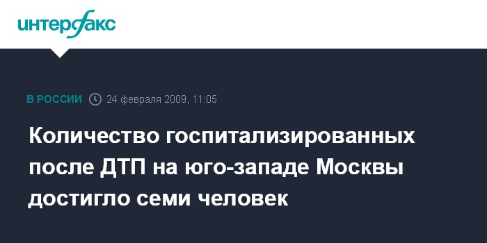 Москва. 24 февраля. INTERFAX.RU - В столичные больницы, по данным на 11:00, доставлены семь человек, пострадавших в результате ДТП на юго-западе Москвы, сообщил "Интерфаксу" во вторник источник в медицинских кругах столицы. "Погибших нет. Состояние госпитализированных мы оцениваем как не тяжелое", - сказал собеседник агентства.