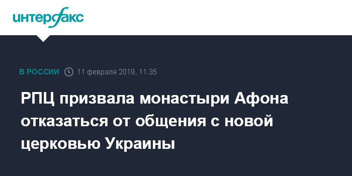 Москва. 11 февраля. INTERFAX.RU - В Русской православной церкви призывают монастыри Афона не вступать в общение с новой церковью Украины и благодарят тех монахов Святой горы, которые отказались принимать у себя делегацию ПЦУ.