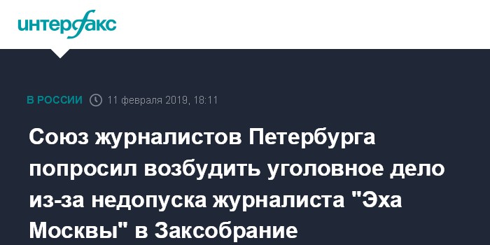 Союз журналистов Петербурга попросил возбудить уголовное дело из-за недопуска журналиста "Эха Москвы" в Заксобрание