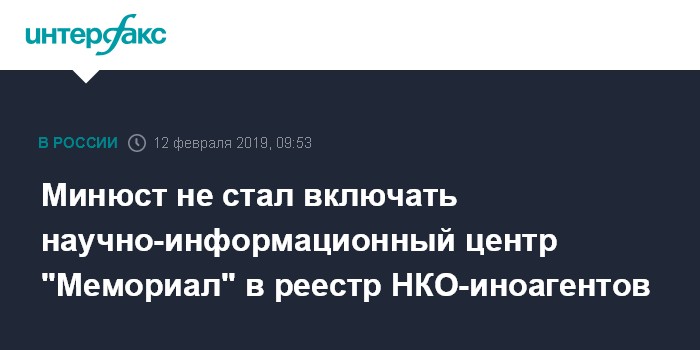 Москва. 12 февраля. INTERFAX.RU - Минюст РФ по итогам внеплановой проверки не стал причислять научно-информационный и просветительский центр "Мемориал" (входит в структуру "Международного мемориала") к некоммерческим организациям, выполняющим функции иностранного агента, сообщает пресс-служба международного общества.