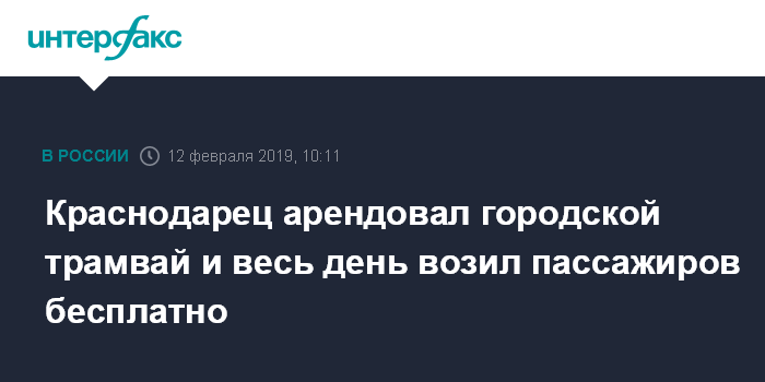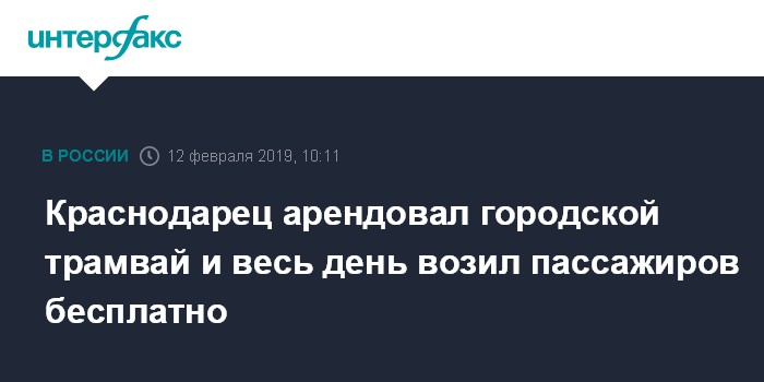 Москва. 12 февраля. INTERFAX.RU - Житель Краснодара арендовал вагон трамвая на один день и сделал проезд в нем бесплатным, сообщили агентству "Интерфакс" в Краснодарском трамвайно-троллейбусном управлении (КТТУ) во вторник.
