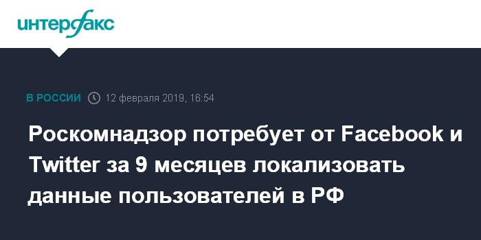 Москва. 12 февраля. INTERFAX.RU - Роскомнадзор в 20-х числах февраля потребует от Facebook и Twitter локализовать базы данных российских пользователей в РФ в течение девяти месяцев, в противном случае компании "будут наказаны", сообщил глава Роскомнадзора Александр Жаров журналистам во вторник.