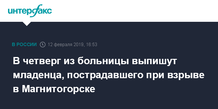 Москва. 12 февраля. INTERFAX.RU - Пострадавшего в результате взрыва в Магнитогорске одиннадцатимесячного Ивана Фокина выпишут в четверг, сообщает во вторник пресс-служба Минздрава.
