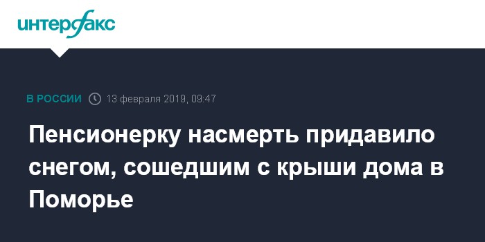 Москва. 13 февраля. INTERFAX.RU - В Архангельской области проводится проверка по факту гибели пенсионерки из-за снега, упавшего с крыши дома, сообщает пресс-служба регионального СКР в среду.